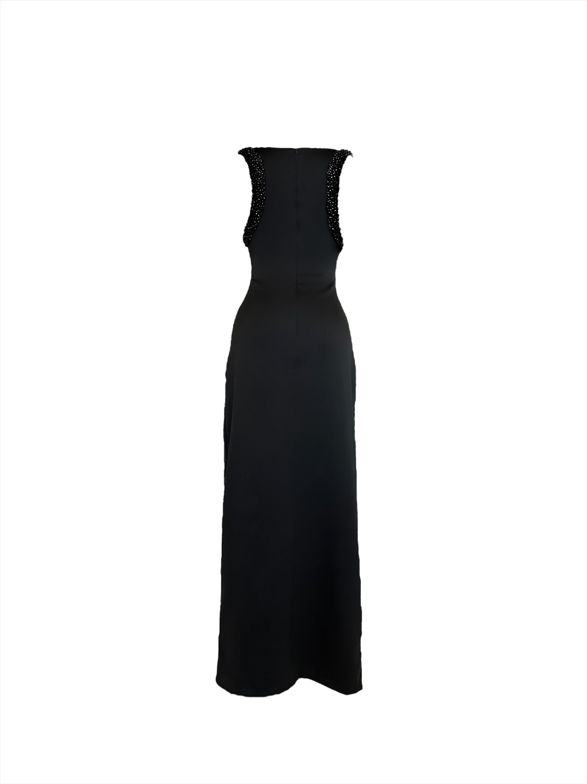 Description: Elegant and refined, this floor length black dress features a boat neckline and hand beaded detailing with black onyx healing crystals at the armholes. The sleek silhouette and crystal accents add a touch of mystique, blending sophistication with spiritual energy for a timeless look.