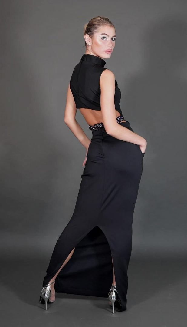 Description: A classic sophisticated mock neck spandex thong bodysuit with an open lower back and closed top with an invisible zipper in the center. Heavyweight Spandex fabric for comfort, compression, and sophistication. Adorned with a one-inch band hand beaded with Back Onyx and Hematite healing crystals paired with a high-waisted maxi skirt with pockets, and a back slit for seamless sophisticated look in the front.