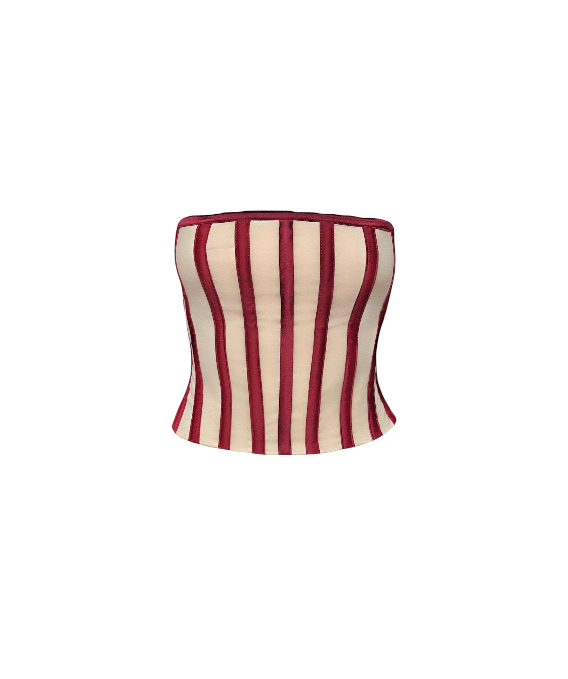 - Nude Satin Corset With Burgundy Silk Taffeta Stripes