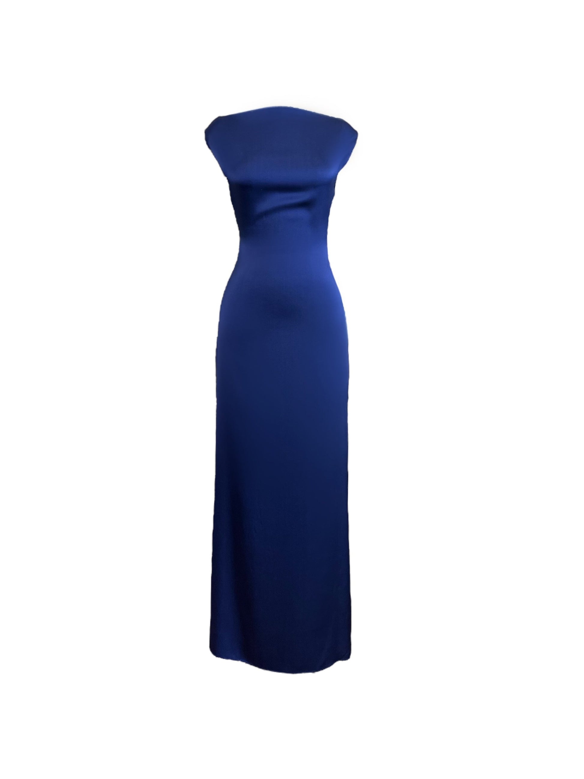 Presenting an exquisite evening piece, this dress captivates with its elegantly sculpted silhouette and luxurious deep blue hue. Designed with a striking curved boat neckline, it flows gracefully into a fitted bodice, accentuating natural curves. The maxi-length drape embodies timeless sophistication, while a discreet left-side invisible zipper ensures a seamless finish. Perfect for refined soirées, this sleeveless dress combines classic allure with modern elegance.