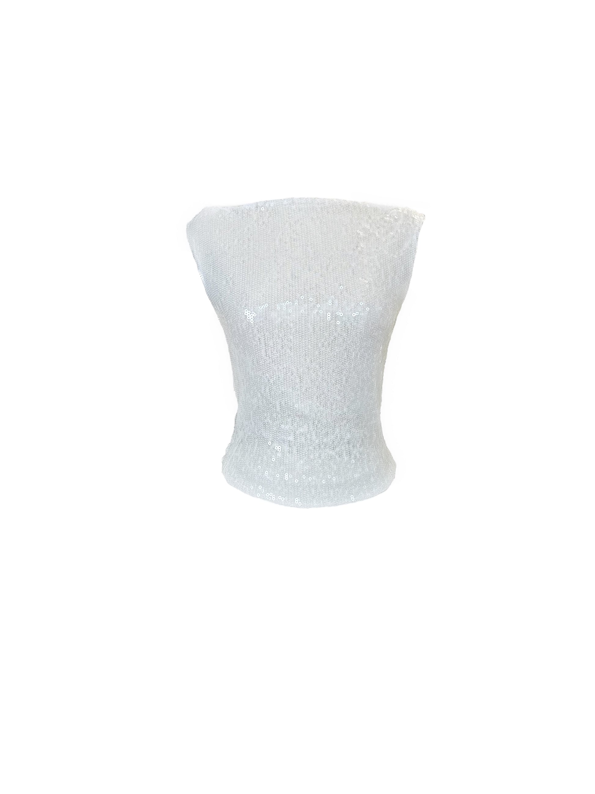 Ivory Sequins High Curved Boatneck Sleeveless Top, a subtle shimmer, sleek and fitted perfect for elevating any look with understated elegance.