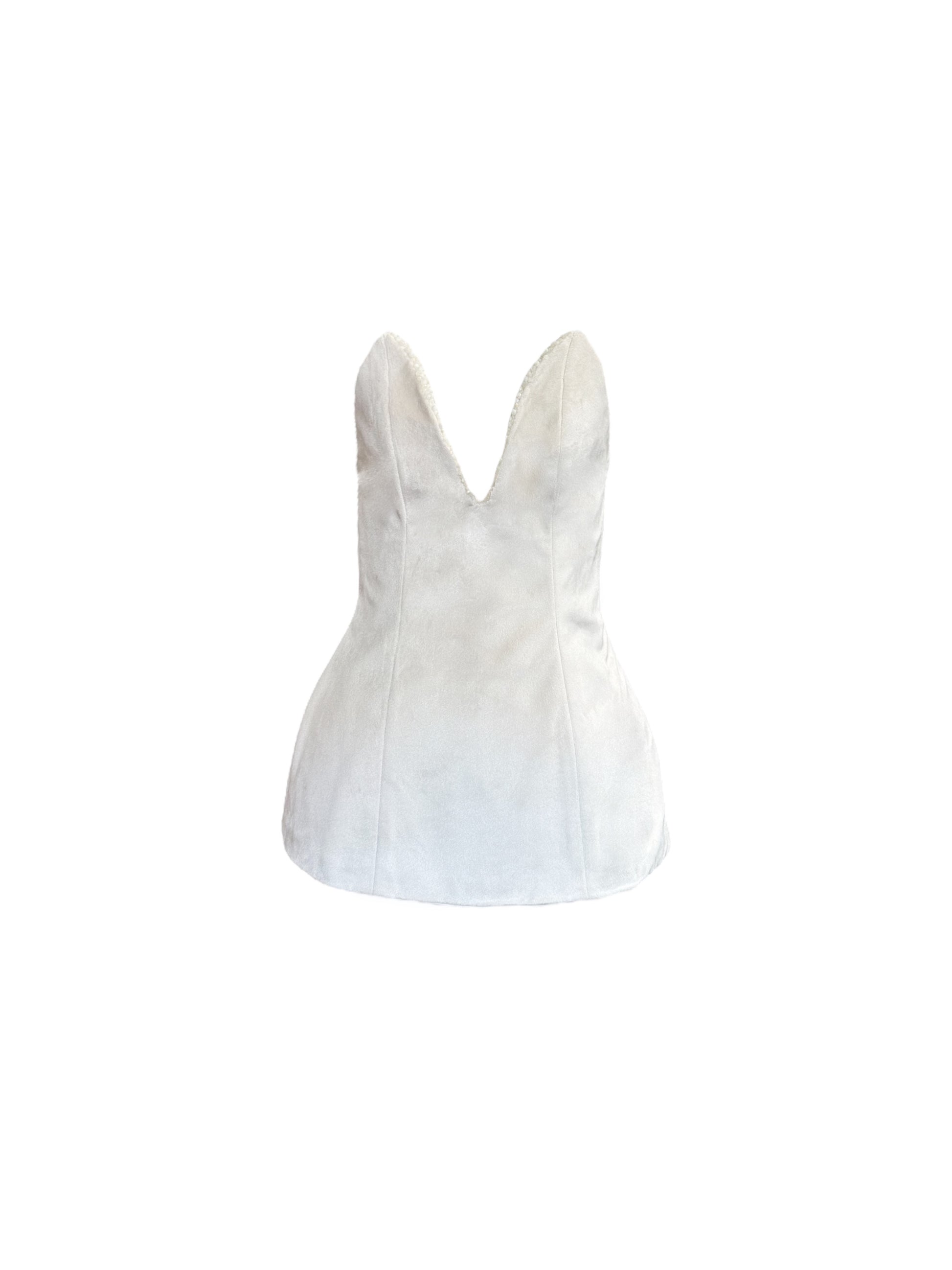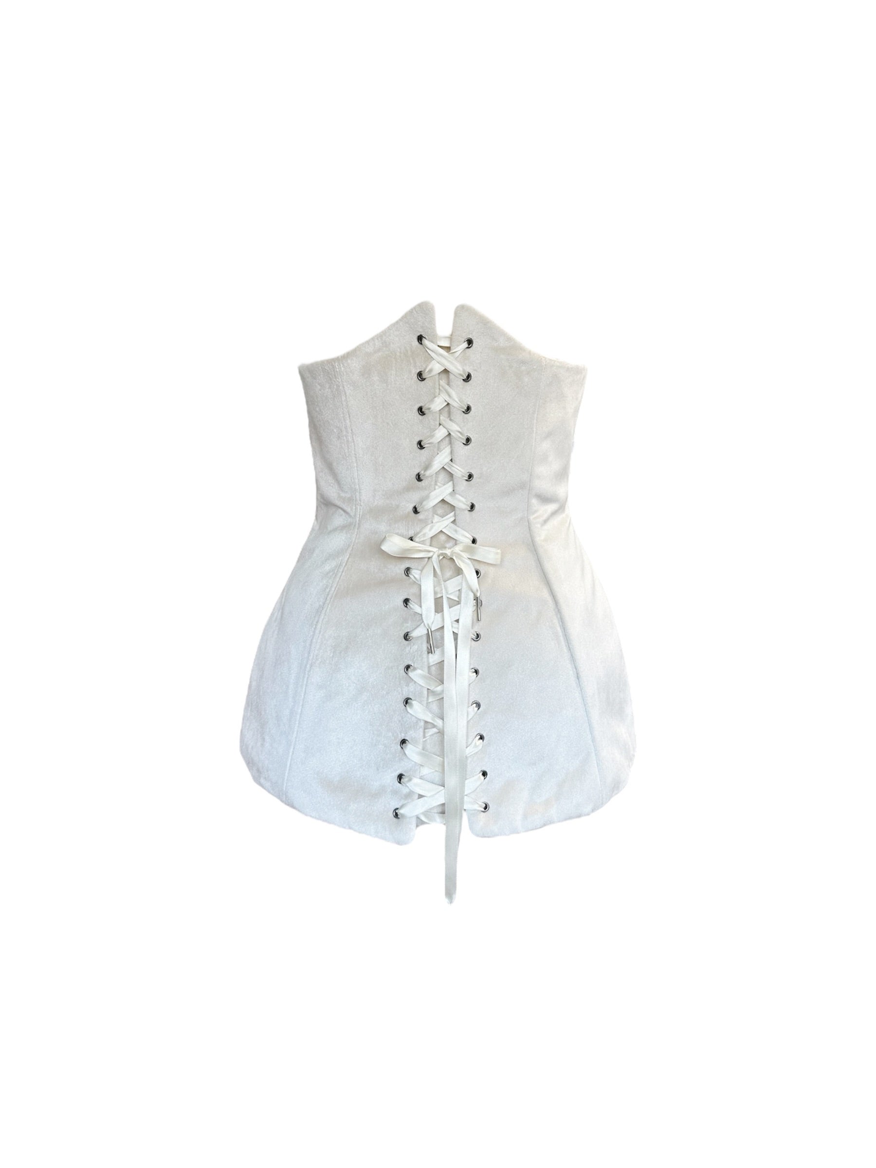 A luxurious ivory velvet corset featuring a hip-length silhouette, delicate beaded bust detail, and adjustable back lacing for refined, tailored fit.