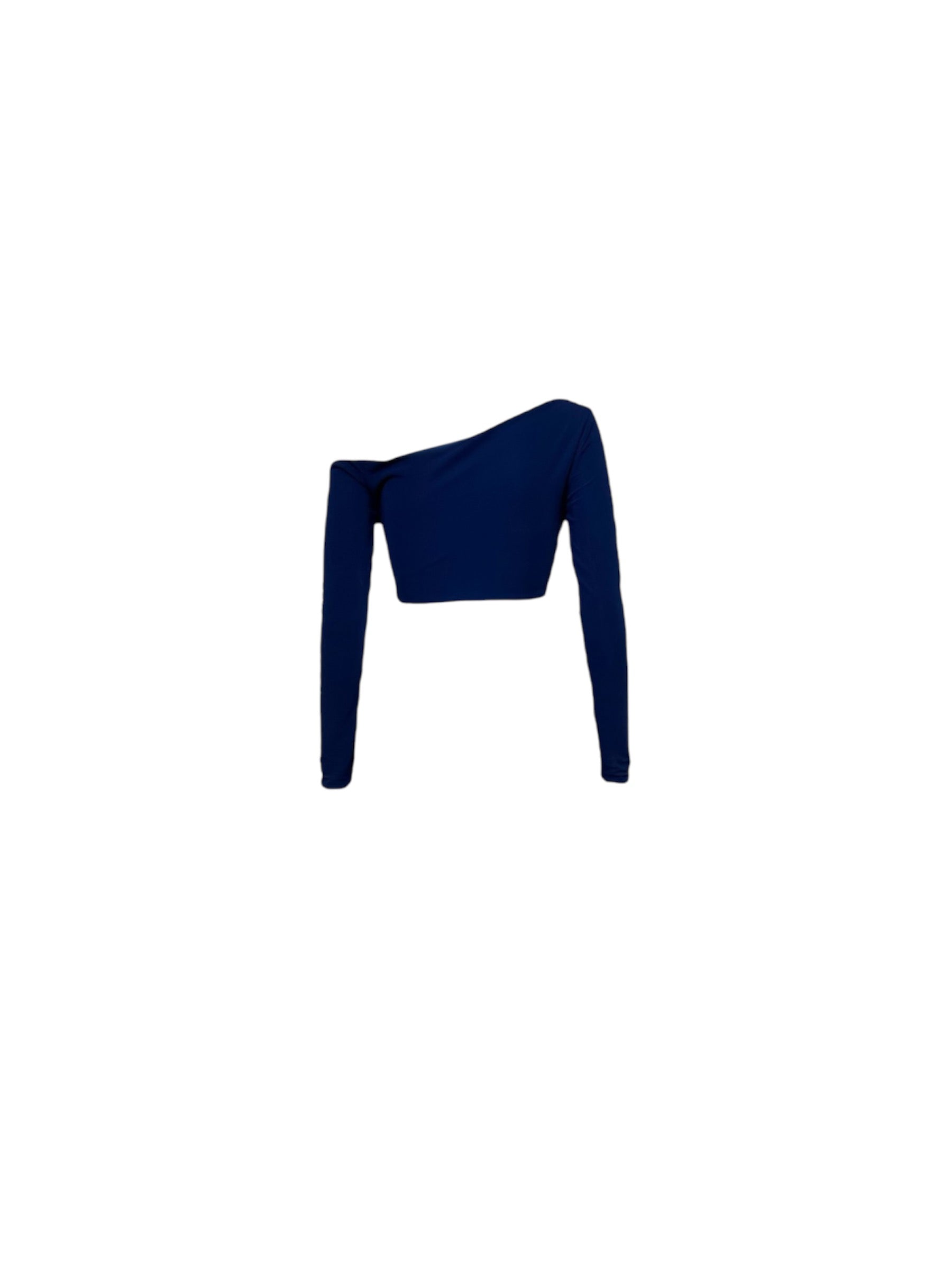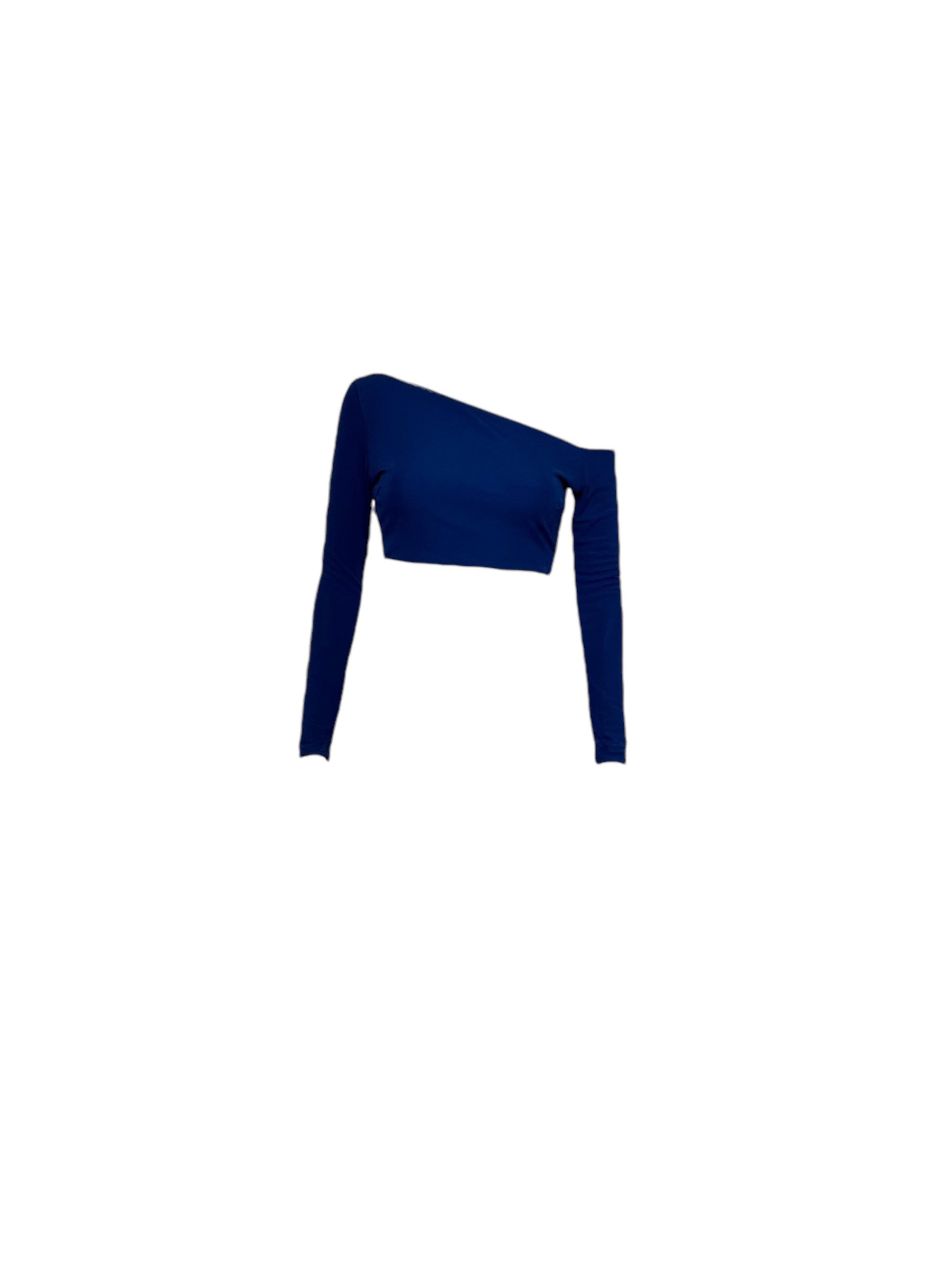 Asymmetrical long-sleeve crop top in stretch rayon viscose. Sleek, Sculpted and effortlessly modern- perfect for elevating any look.