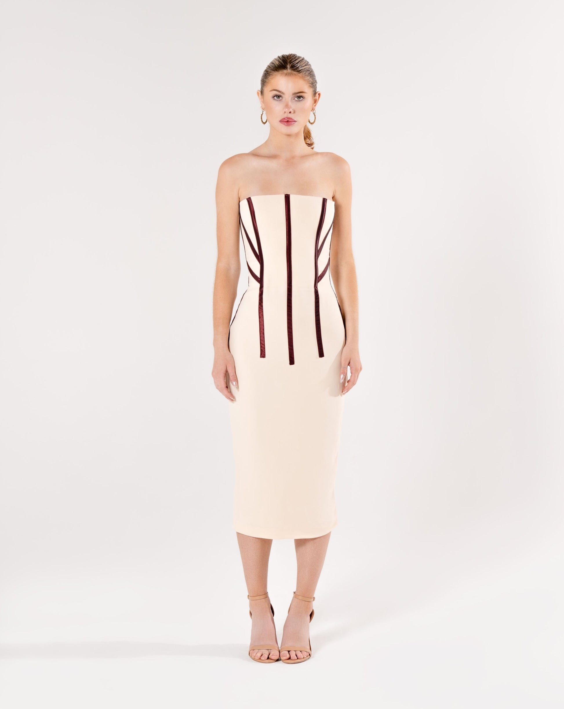 Description: The Nude and Maroon Dress is the perfect combination of sexiness and sophistication. The dress is thoughtfully outlined by sewn thin maroon stripes to give an hourglass silhouette to all who wear it. A form-fitting design with a midi hemline with a slit in the back to provide a moveable allowance.