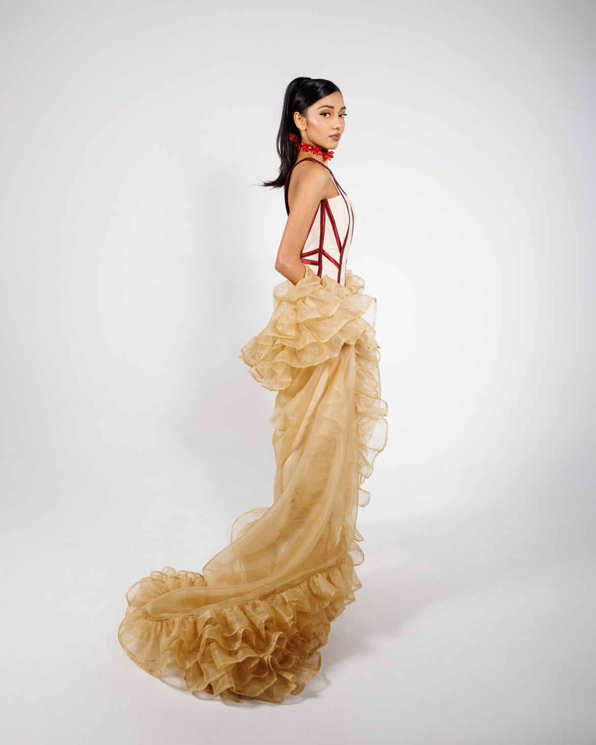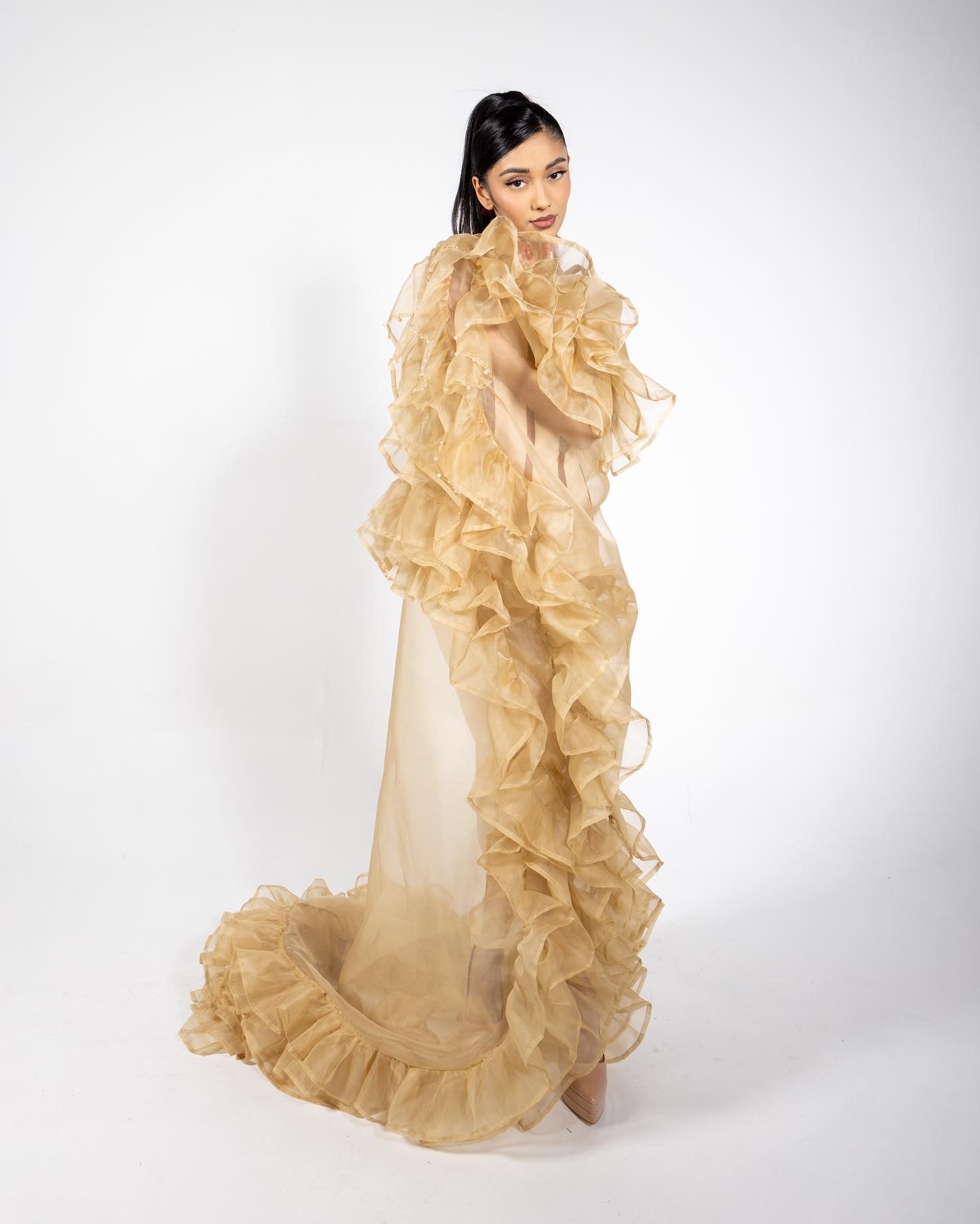 Nude Silk Organza Ruffled Cape SHOW PIECE