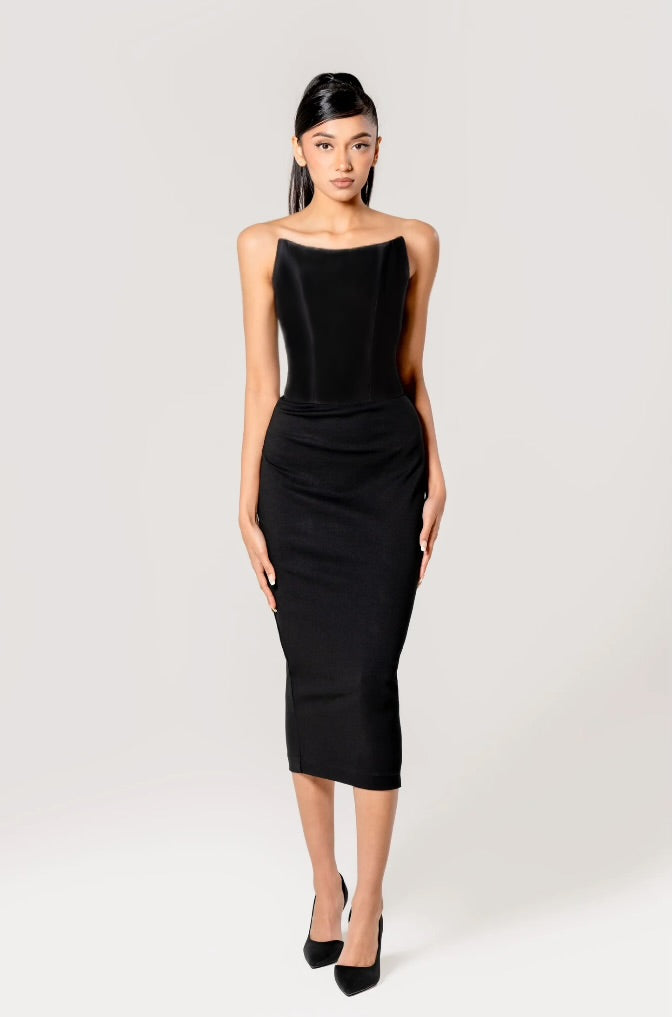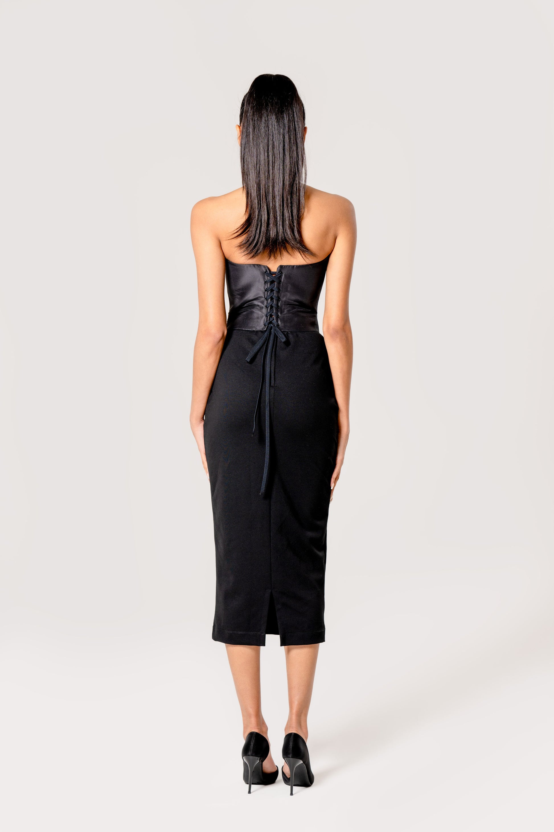 Top The Black Corset Top is a strapless bustier top with boning around the bodice to create a structured look. A modern take on the sweetheart neckline. It is made with a luxuriously soft black silk taffeta fabric that is laced in the back with an adjustable piece of ribbon to ensure the perfect fit. It pairs well with one of Medina’s trousers or fitted skirts.