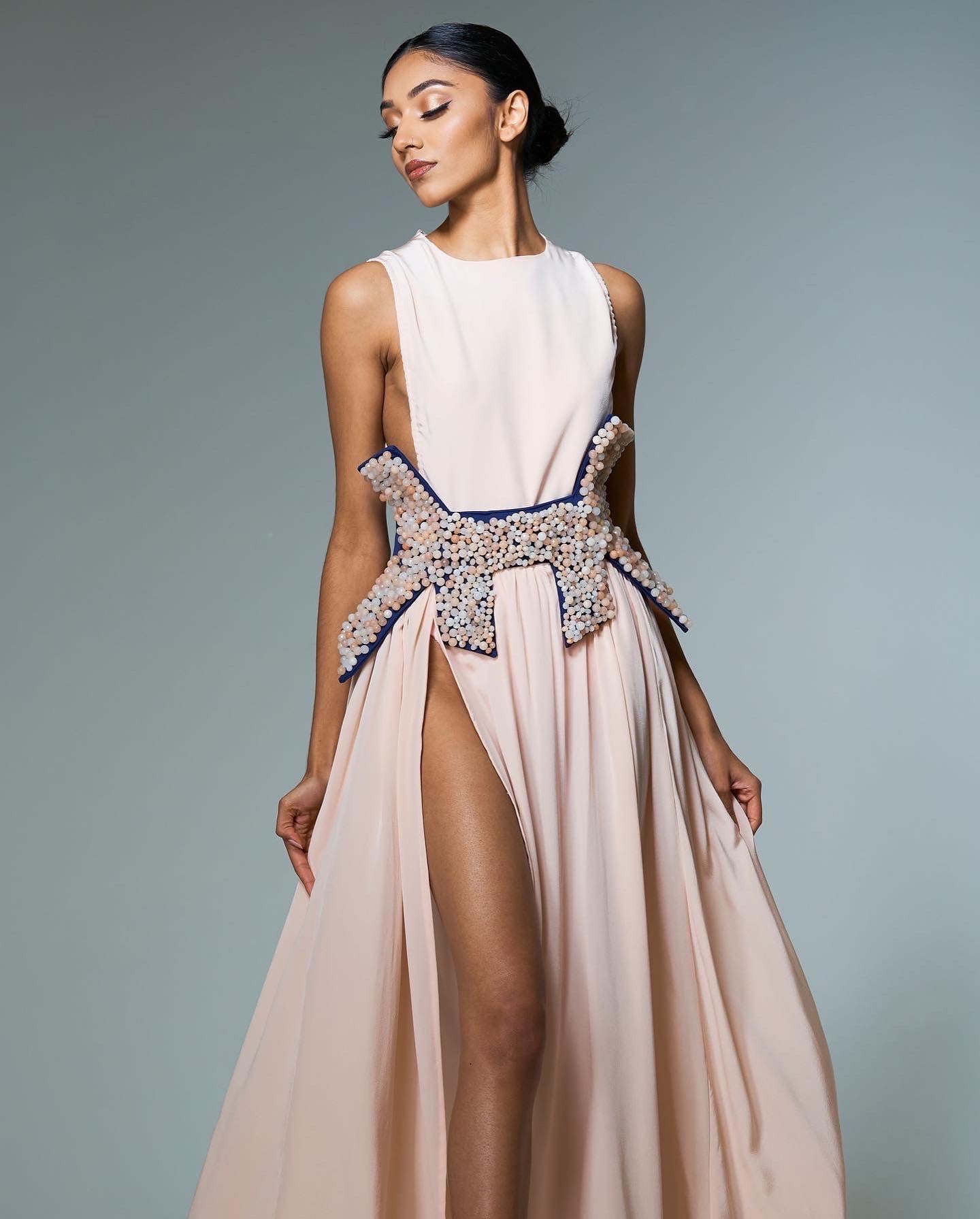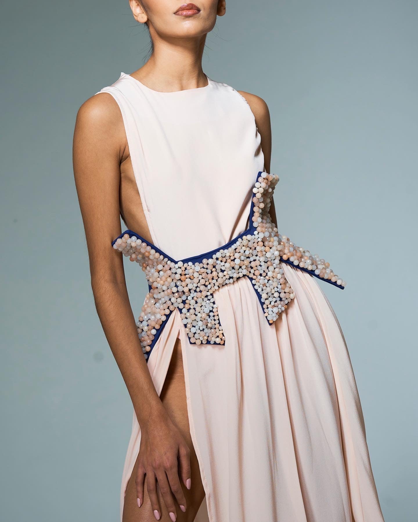 Rose quartz belted set is a regal look. The addition of the beaded belt exhibits a beautifully crafted detail that accentuates the silhouette, as well as implements the powers of the rose quartz healing crystals. It is a removable accessory. The gown has a high slit on the skirt and open sides to the bodice. These imperial pieces can be dressed up or down.
