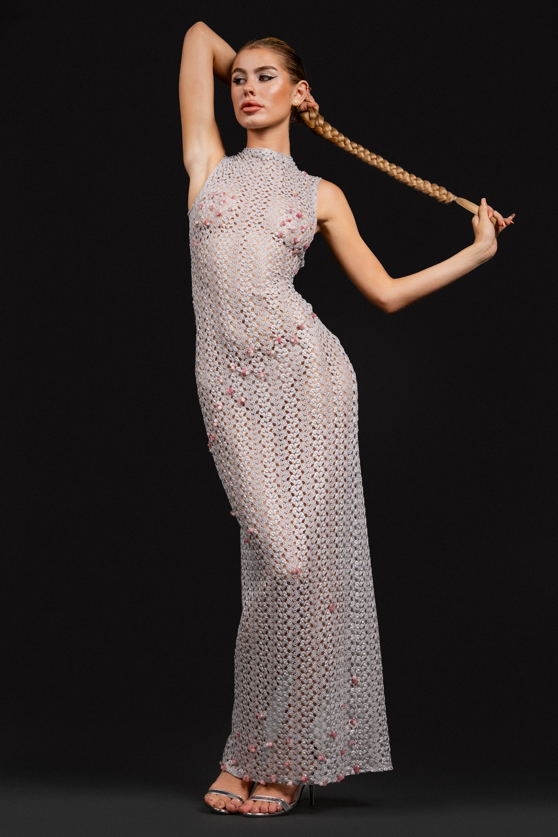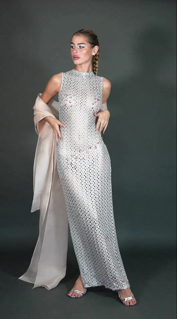 Description: The exquisite silver-coated crochet is a true embodiment of timeless elegance and artisanal craftsmanship perfect for a beach vacation. This enchanting piece features delicate crochet work with a lustrous silver coating that adds a touch of sophistication and glamour to any ensemble hand beaded with Rose Quartz, Pink Jade and Agate Healing Stones. A pale pink 100% silk chiffon statement shawl is a complimentary must!