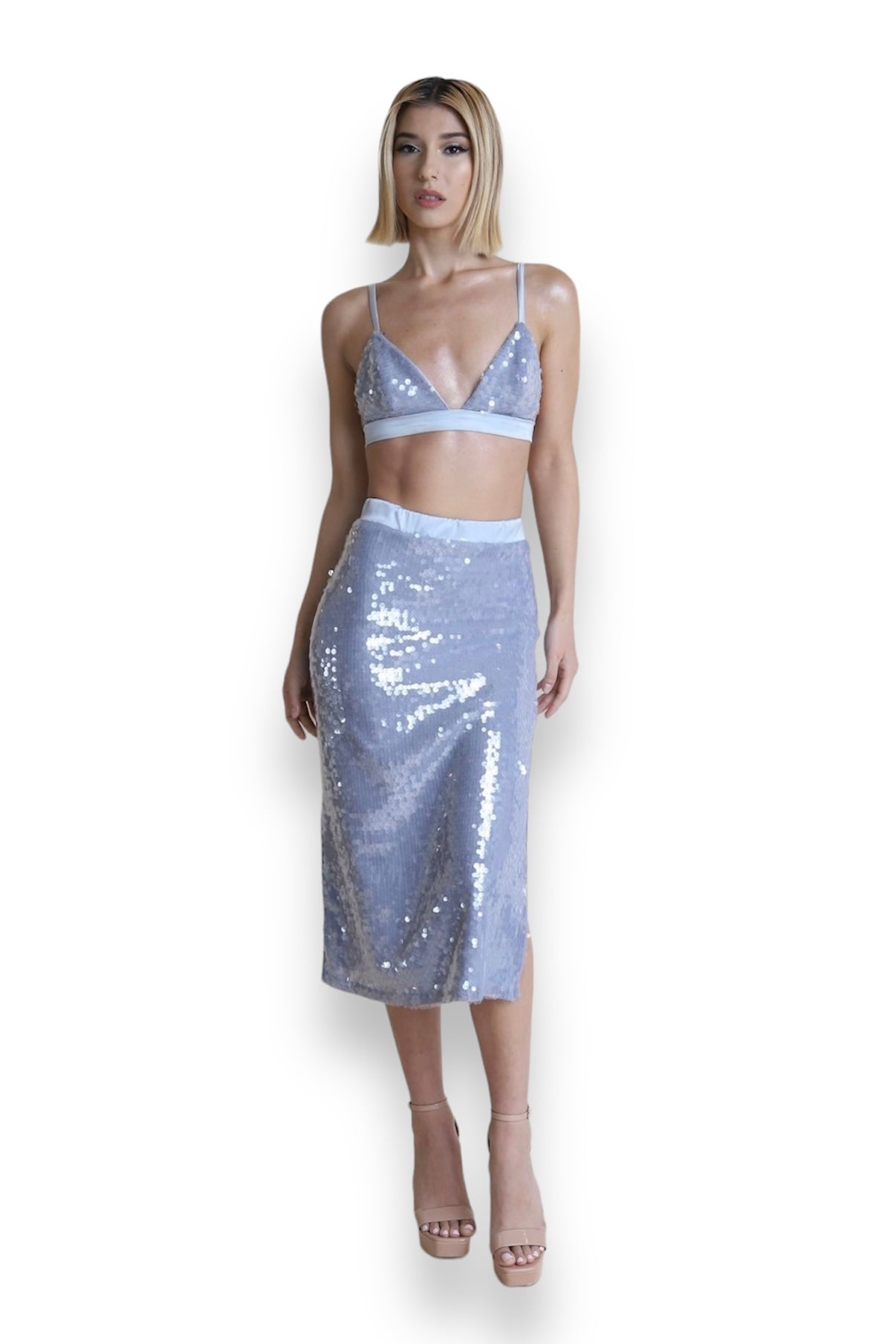 Sexy Classy Sequins set triangle bralette and midi skirt with side slit both lined with stretch silk charmeuse.