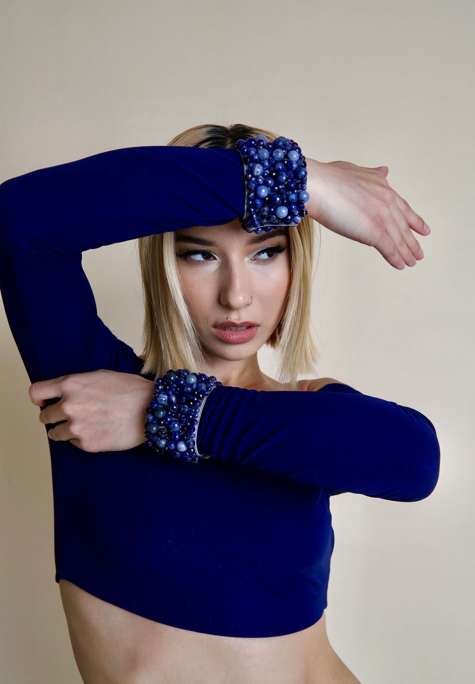 The Sodalite Bracelet Set is a luxurious hand-embroidered accessory featuring healing Sodalite crystals, designed for those seeking elegance and wellness. Available for pre-order, this set is ideal for adding a spiritual touch to your wardrobe.