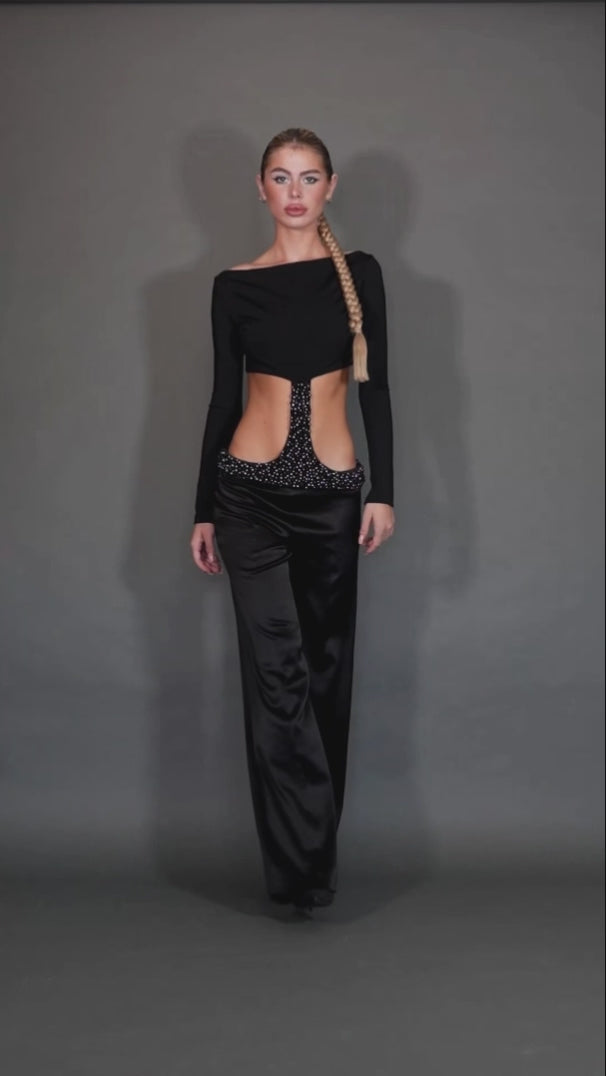 Description: Elevate your style with this ensemble featuring a boat neck crop top with a statement belt attachment, this belt is hand embroidered with a combination of black onyx and hematite healing crystals. The belt ties in the back with silk satin ribbon paired with wide-leg low-rise satin trousers.